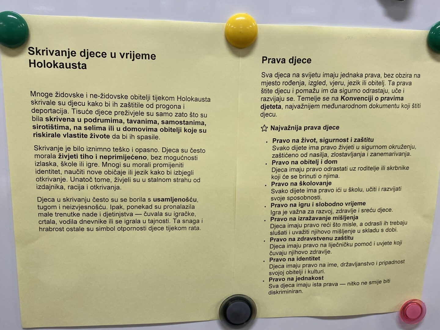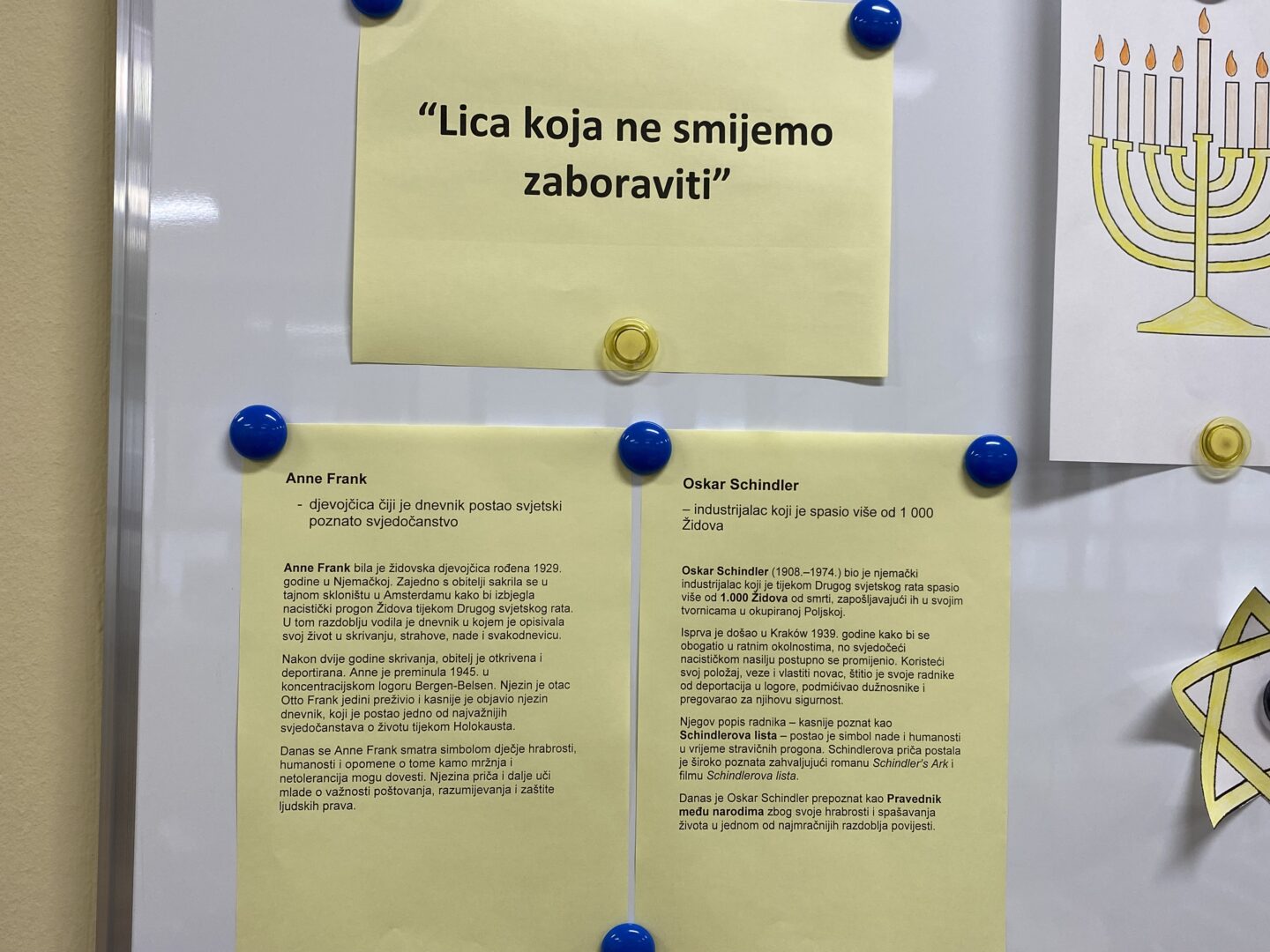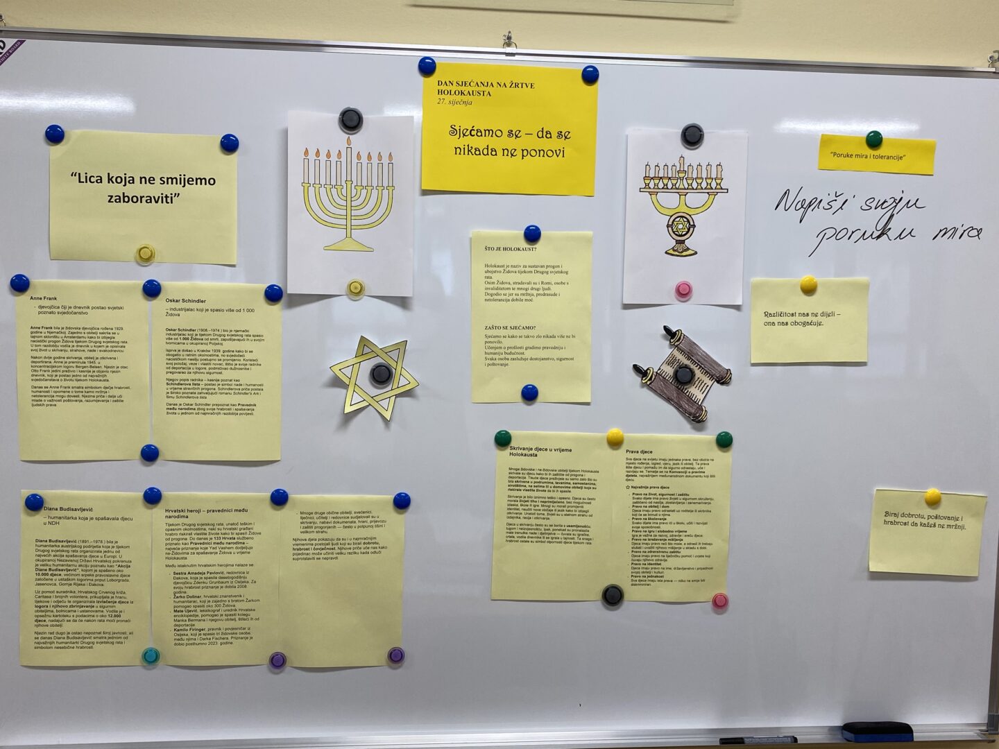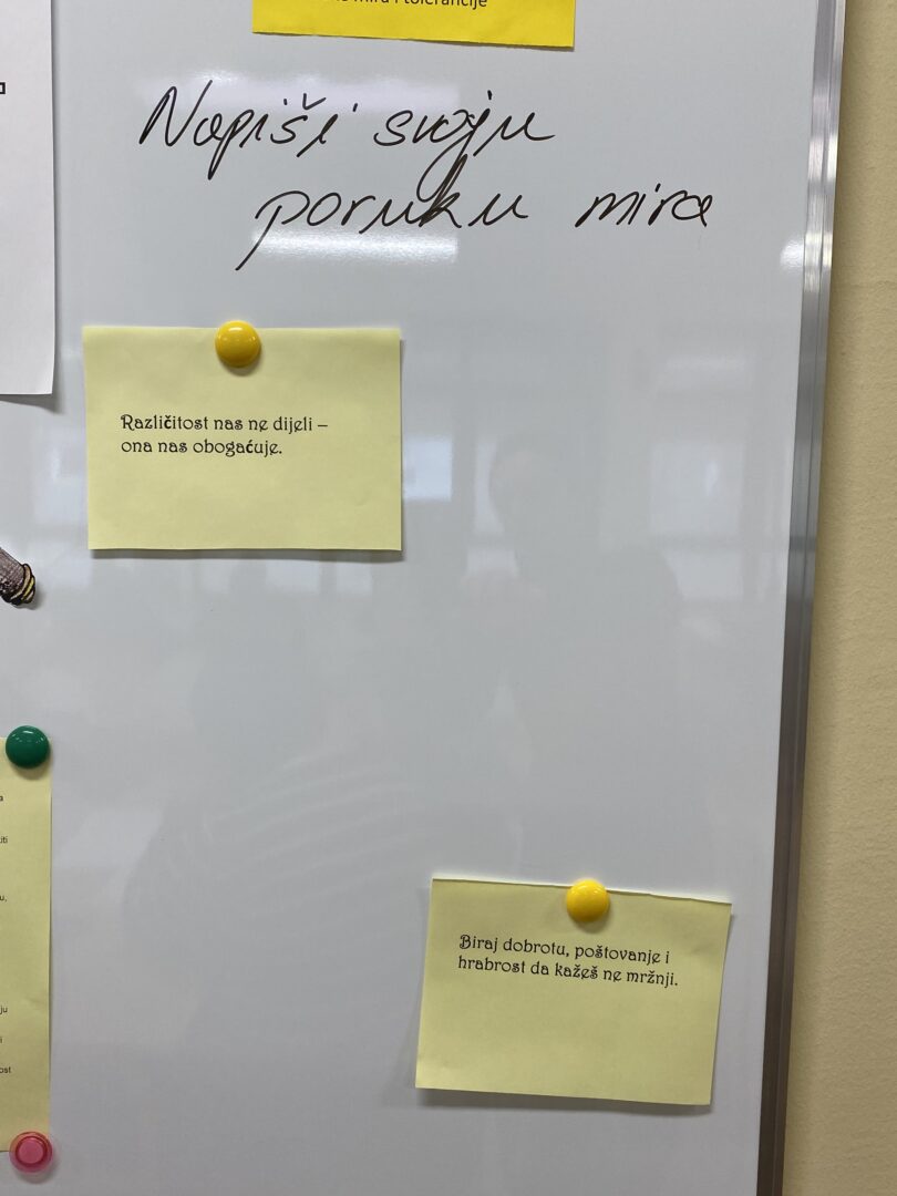 U našoj je školi na satu povijesti kod nastavnice Helene Sakoman obilježen Dan sjećanja na žrtve Holokausta kroz niz edukativnih i refleksivnih aktivnosti na satu povijesti. Učenici su pogledali kratak edukativni film o Holokaustu, a na panou u učionici imali su priliku pročitati tekstove o značenju i posljedicama Holokausta te kratke crtice iz života osoba koje su se istaknule svojom hrabrošću i humanošću u tom razdoblju. Među njima su bili Oskar Schindler, Dijana Budisavljević, osječanin Kamilo Firinger i brojni drugi nositelji povelje Pravednik među narodima, koji su nesebično pomagali i spašavali živote Židova tijekom Drugog svjetskog rata. Učenici su svoje sudjelovanje zaokružili pisanjem poruka mira i tolerancije na ploči, naglašavajući važnost sjećanja, suosjećanja i poštivanja različitosti.