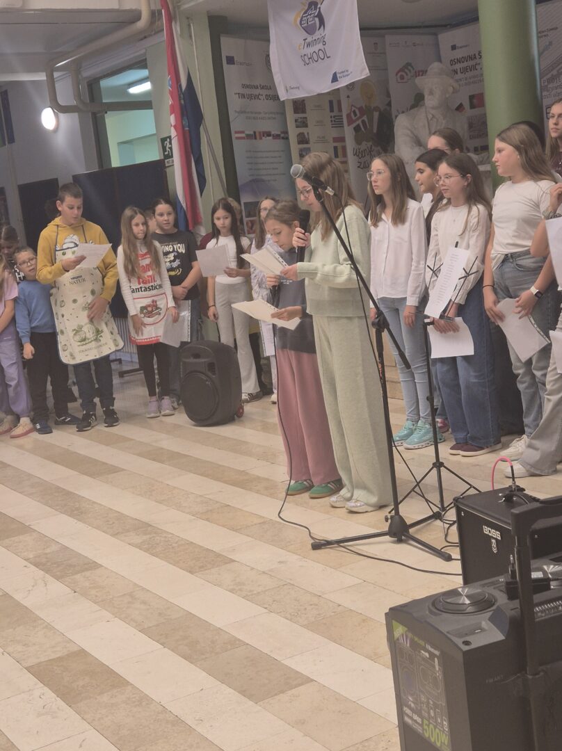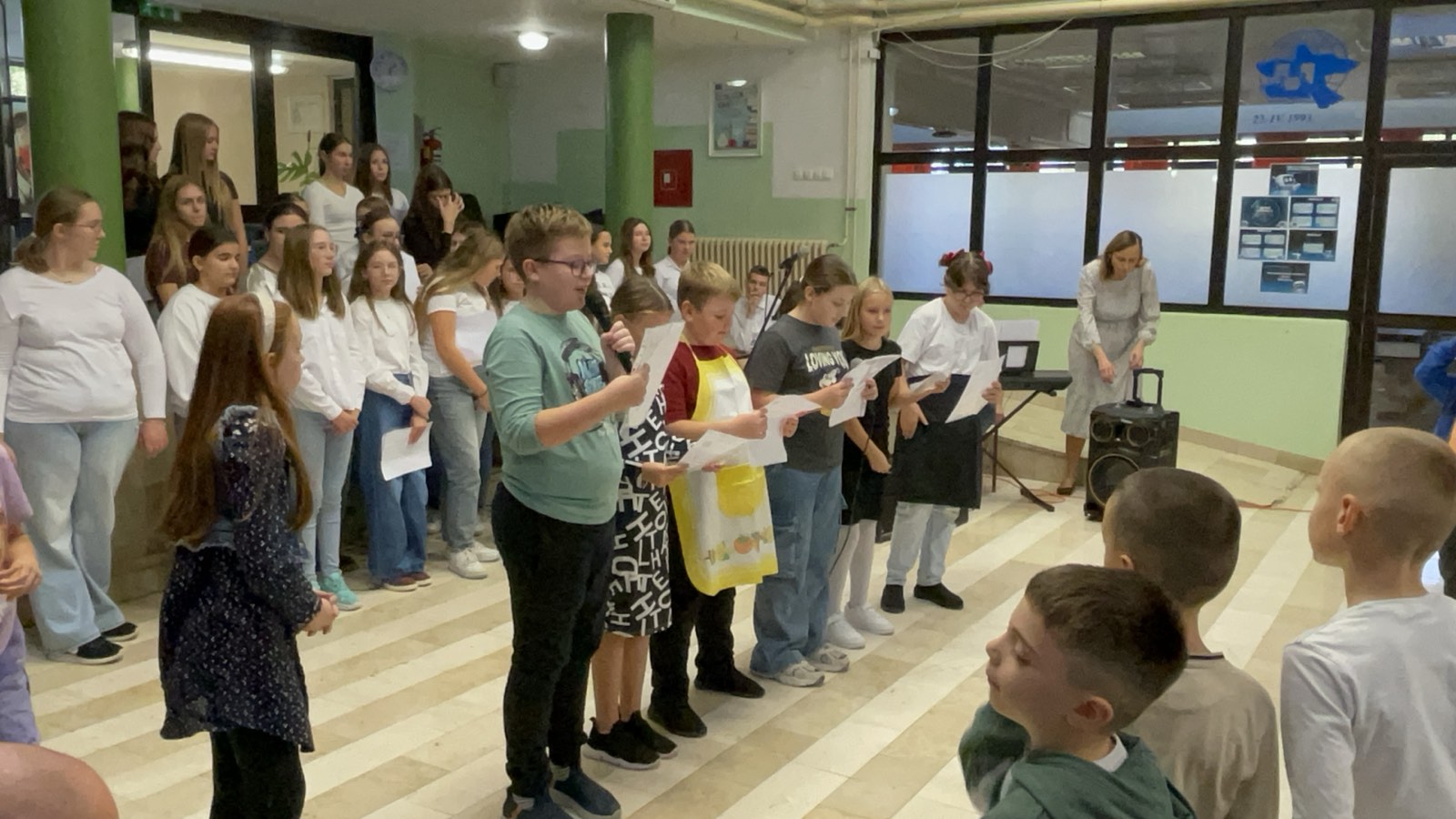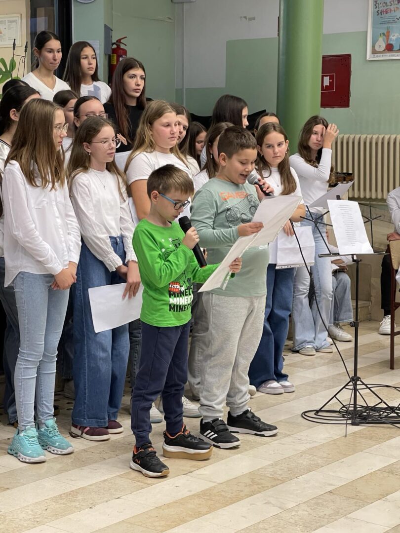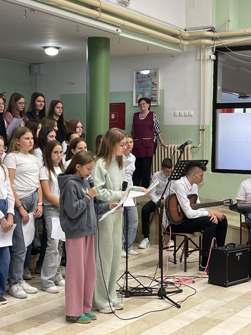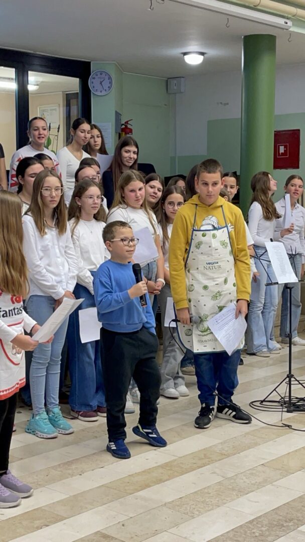 Učenici 5.a razreda bili su u ulozi voditelja. Opušteno i glasno pozivali su prvašiće, drugašiće, trećaše i četvrtaše na recitiranje, pjevanje i igrokaz. Profesorica Andrea Opačak je s velikim zborom otpjevala pjesme zahvale Stvoritelju od nas stvorenja, stvarajući radosno i dirljivo ozračje.
