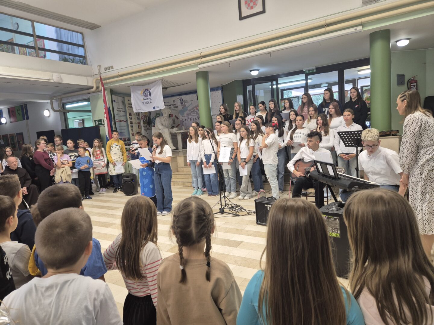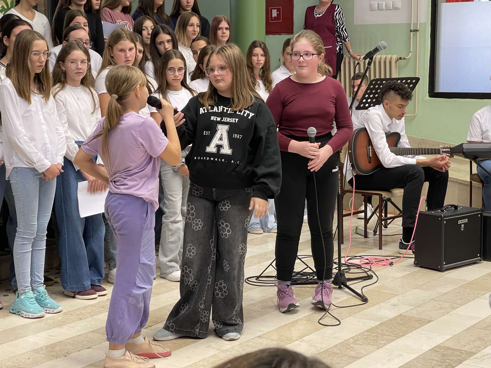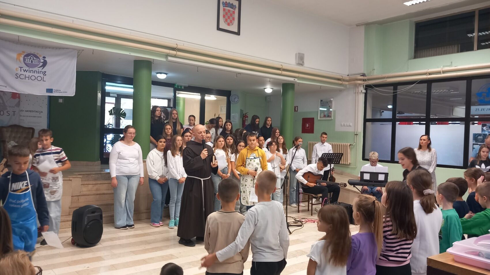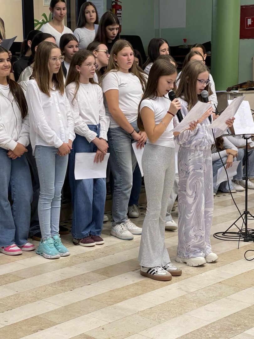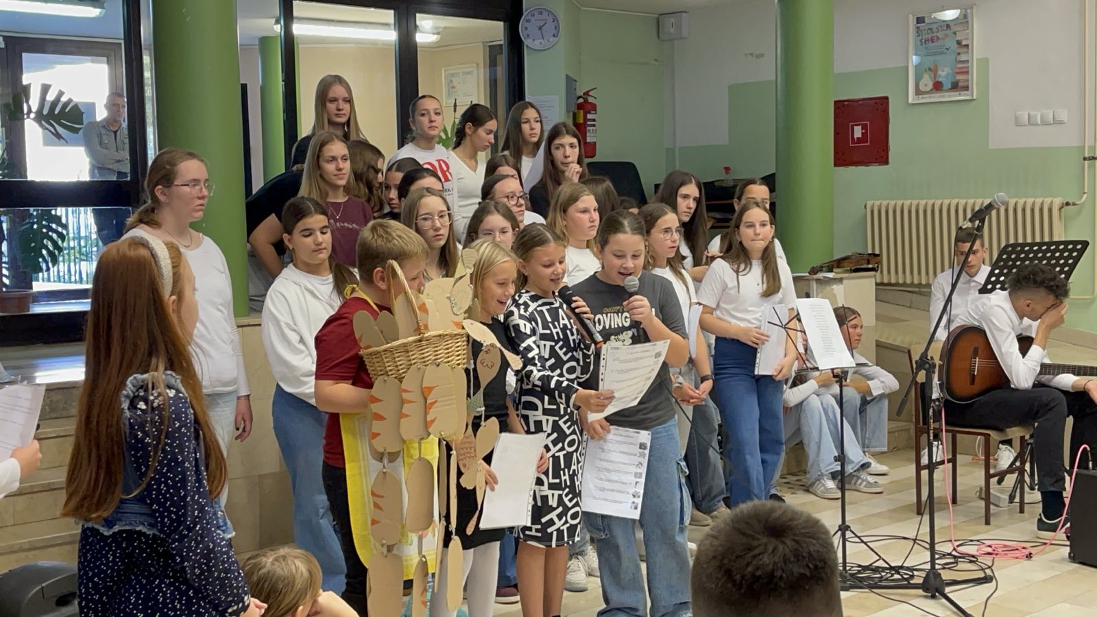Učenici 5.a razreda bili su u ulozi voditelja. Opušteno i glasno pozivali su prvašiće, drugašiće, trećaše i četvrtaše na recitiranje, pjevanje i igrokaz. Profesorica Andrea Opačak je s velikim zborom otpjevala pjesme zahvale Stvoritelju od nas stvorenja, stvarajući radosno i dirljivo ozračje.