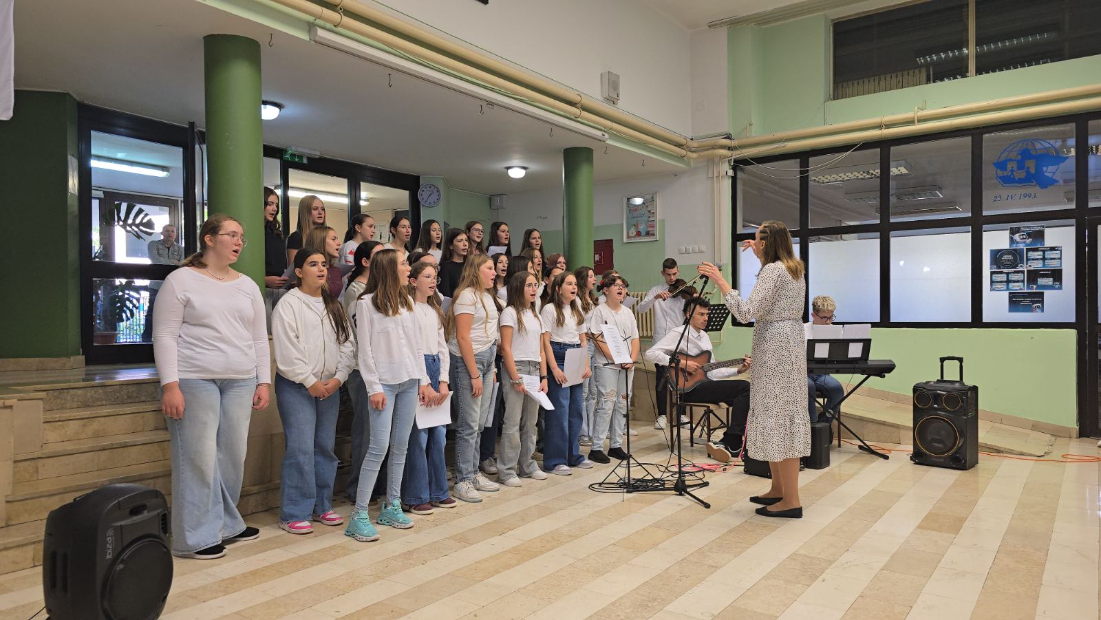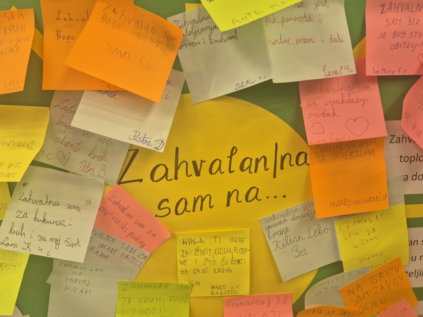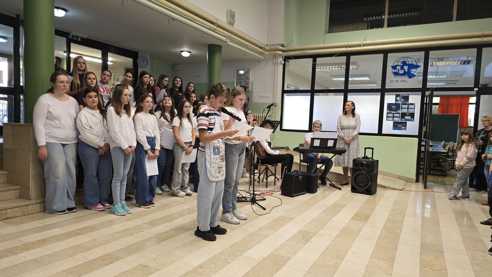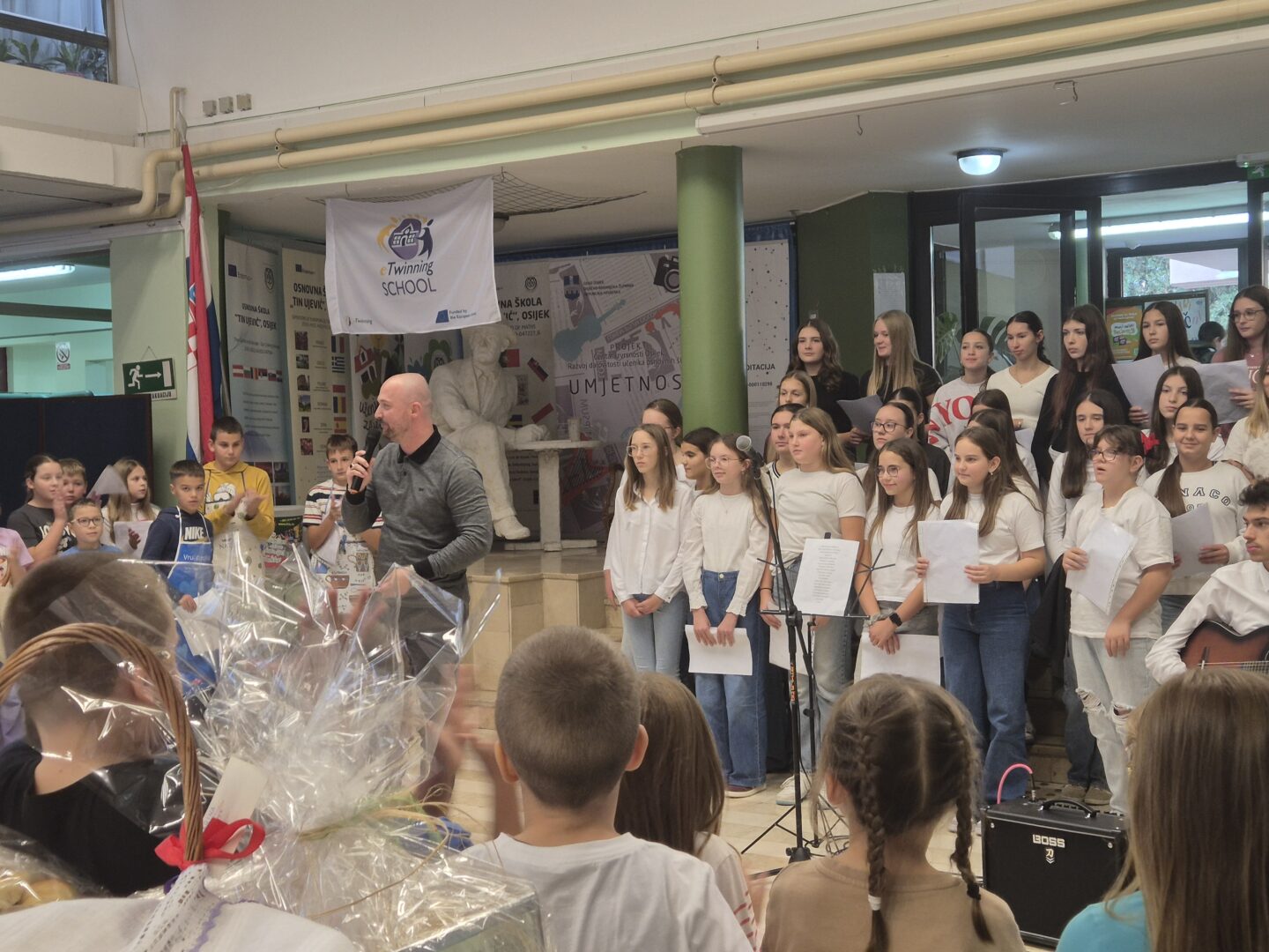 Učenici 5.a razreda bili su u ulozi voditelja. Opušteno i glasno pozivali su prvašiće, drugašiće, trećaše i četvrtaše na recitiranje, pjevanje i igrokaz. Profesorica Andrea Opačak je s velikim zborom otpjevala pjesme zahvale Stvoritelju od nas stvorenja, stvarajući radosno i dirljivo ozračje.
