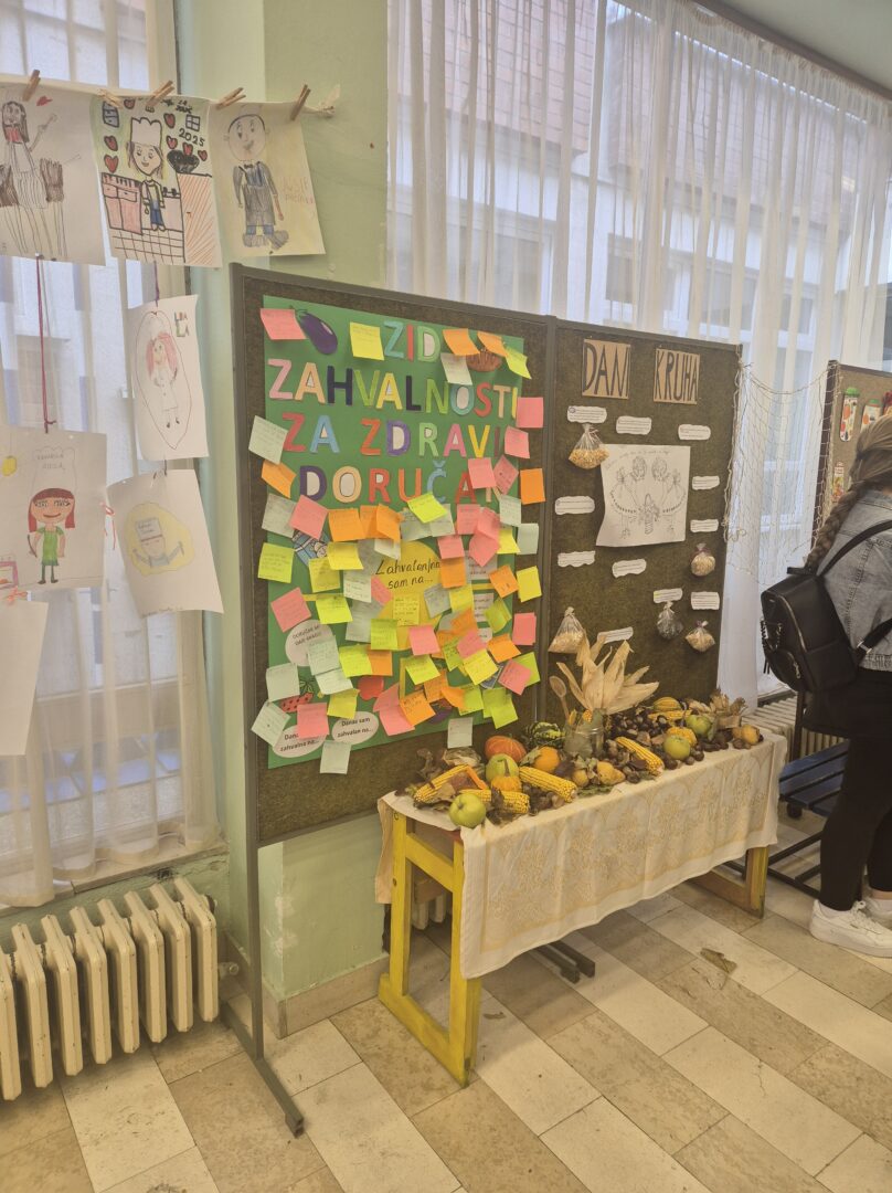 Sve ove dane povezali smo i s našim kuharima Ivanom i Antom koji su izradili izvrstan pano Tjedan zdravog doručka pa su ih učenici rado nacrtali i svoje radove izložili u kuhinji. Ostali panoi, vidi se sve na priloženim fotografijama, dječji su radovi pod naslovom: „Prodajem jesenske plodove na tržnici Jug 2“ i „Pravimo zimnicu“ kako bi doživjeli bogatstvo tradicije, običaja i susreta. S tim mislima zahvalnosti radovat ćemo se do sljedećeg listopada.