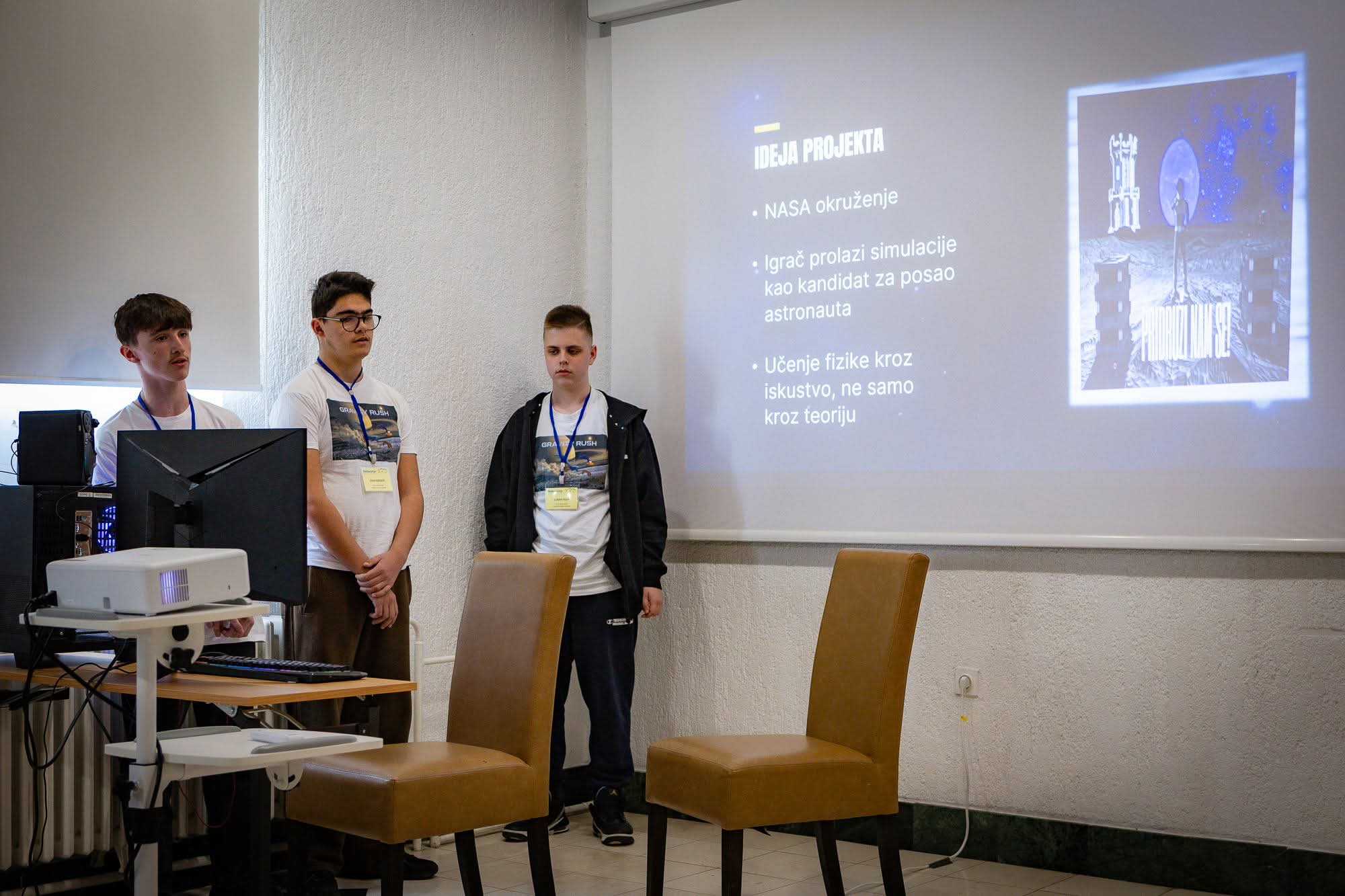 Učenici su predstavili projekt Gravity Rush, edukativnu avanturističku igru razvijenu u razvojnom alatu Unreal Engine 5. Igra se temelji na interaktivnim simulacijama fizikalnih sadržaja poput gravitacije, gibanja, sile i energije u futurističkom okruženju. Posebnost projekta je sustav promjenjive gravitacije te povezivanje teorijskih znanja s praktičnom primjenom kroz igru.
