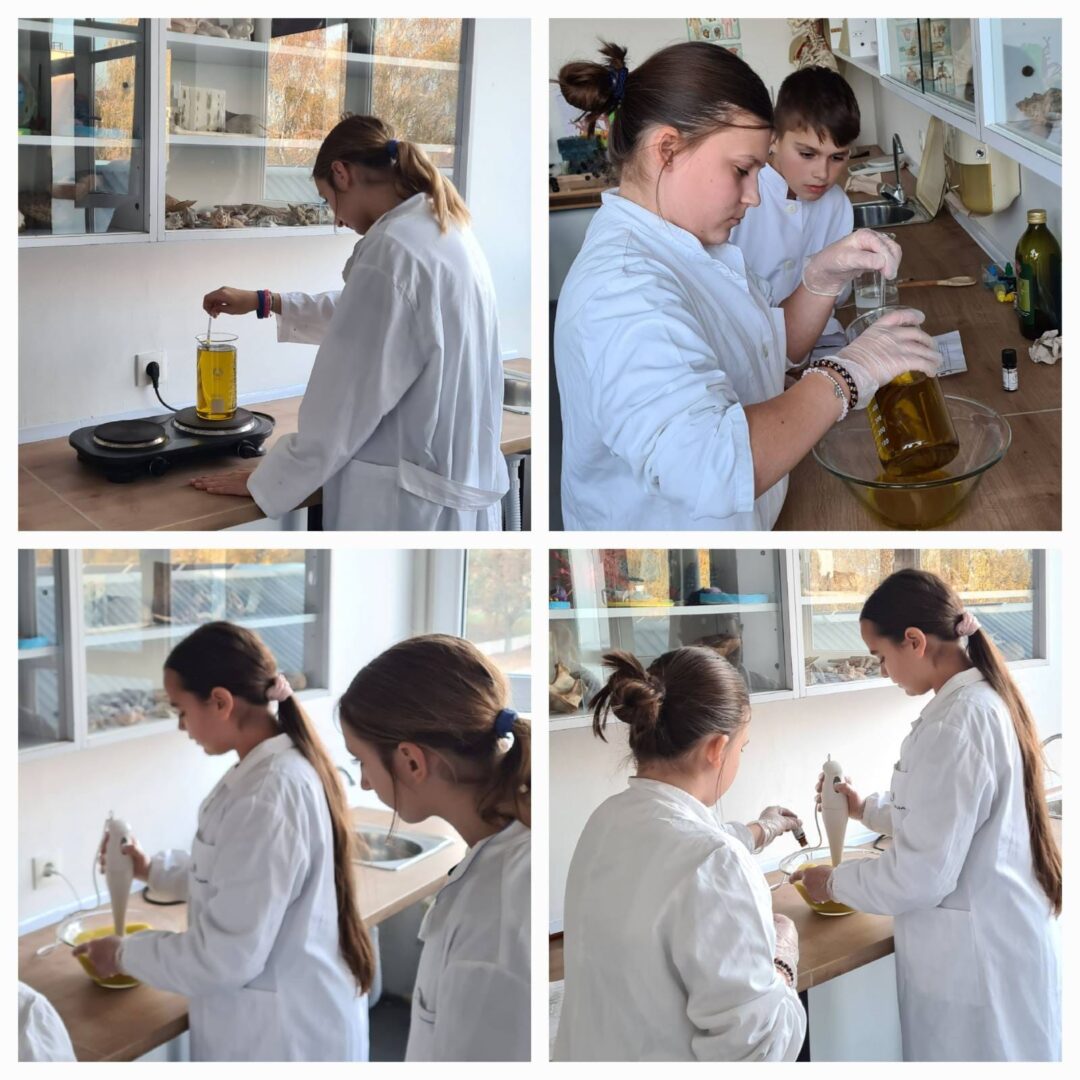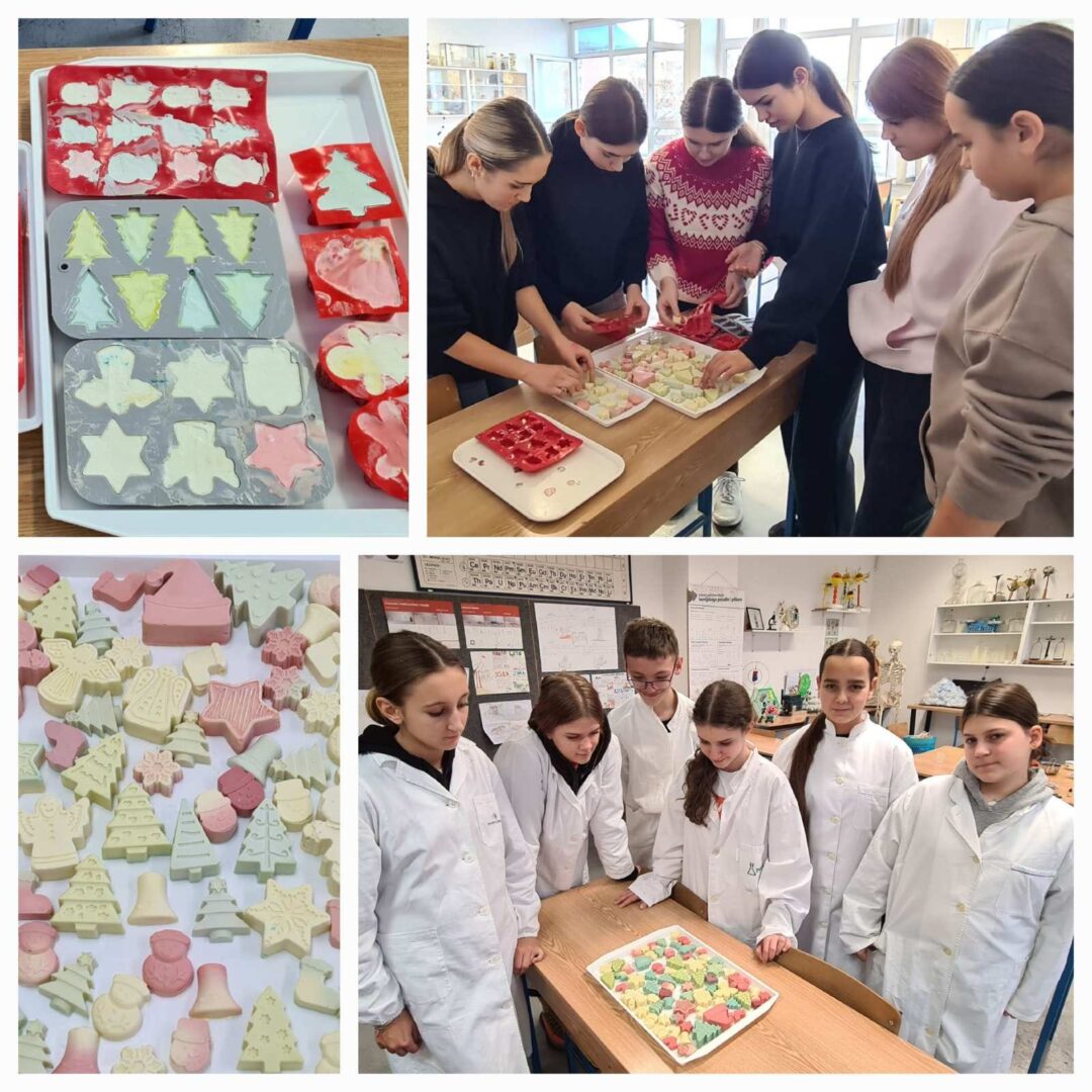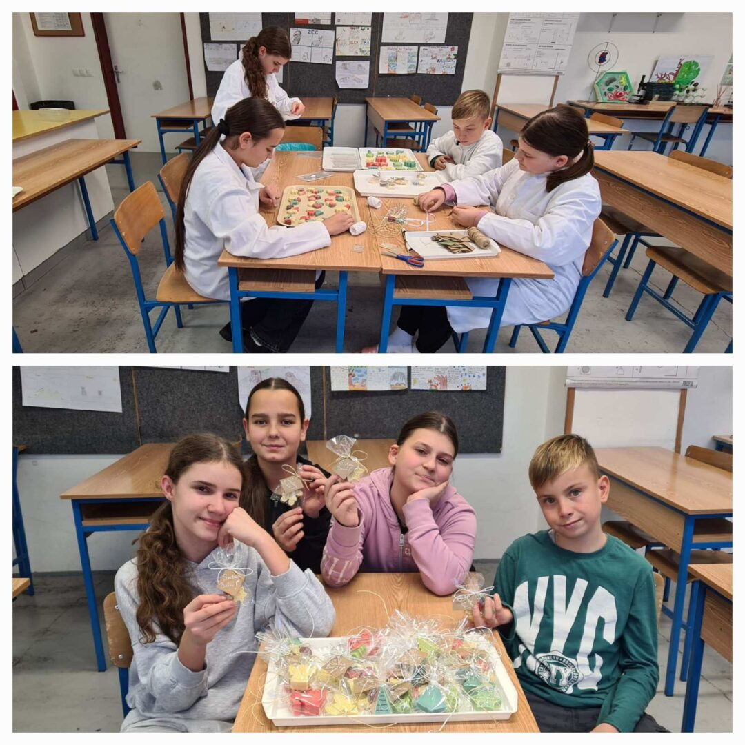 Sedmaši su potom izradili vlastite sapune koristeći natrijevu lužinu, maslinovo ulje, jestive boje i eterična ulja. S velikim zanimanjem vagali su sastojke, miješali smjesu, birali i dodavali boje i mirise, a zatim punili kalupe raznih božićnih oblika. Učionicom se ubrzo proširio ugodan i opojan miris svježe pripremljenih sapuna.