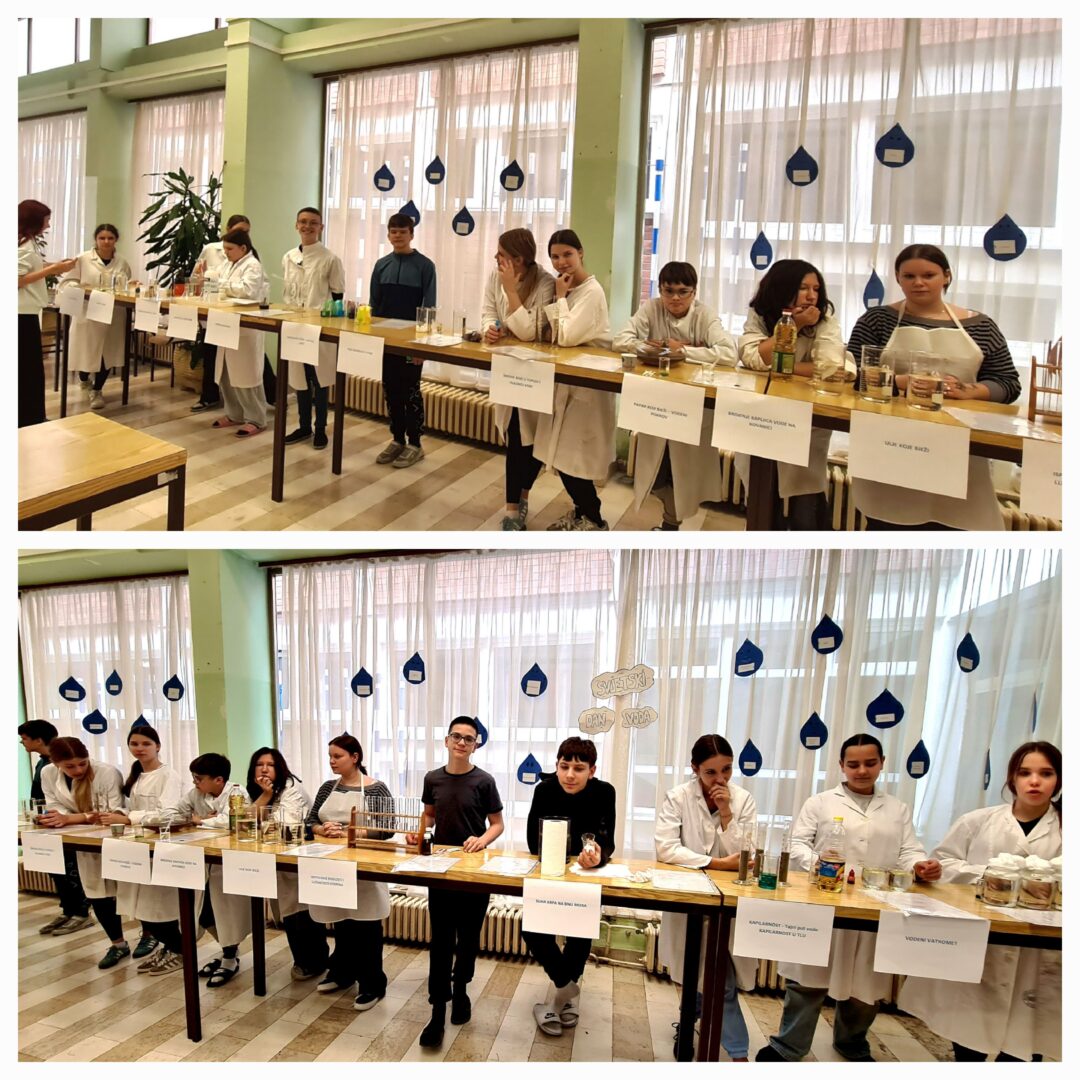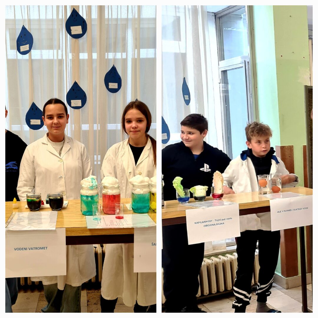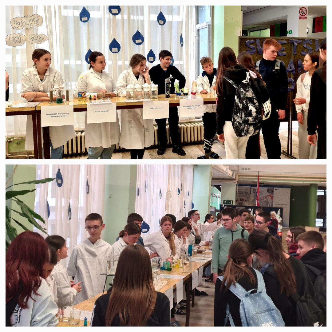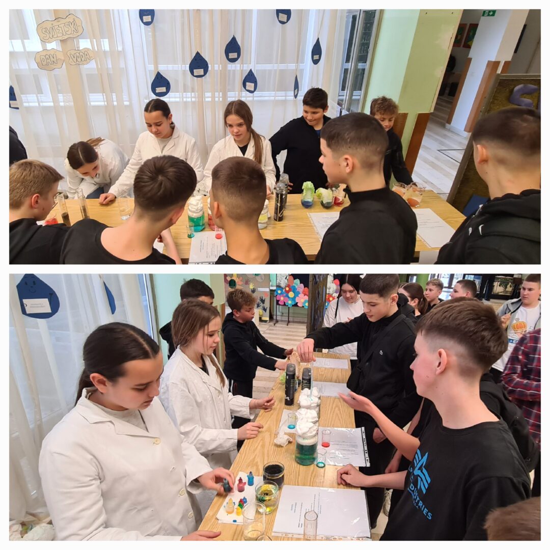 U holu škole obilježen je Svjetski dan voda kroz zanimljivu i edukativnu radionicu u kojoj su sudjelovali učenici 7. a razreda uz pomoć nastavnice kemije Tajane Barna. Učenici su pripremili te više puta demonstrirali i objasnili 20 pokusa s vodom pred učenicima 8. a i 8. b razreda.