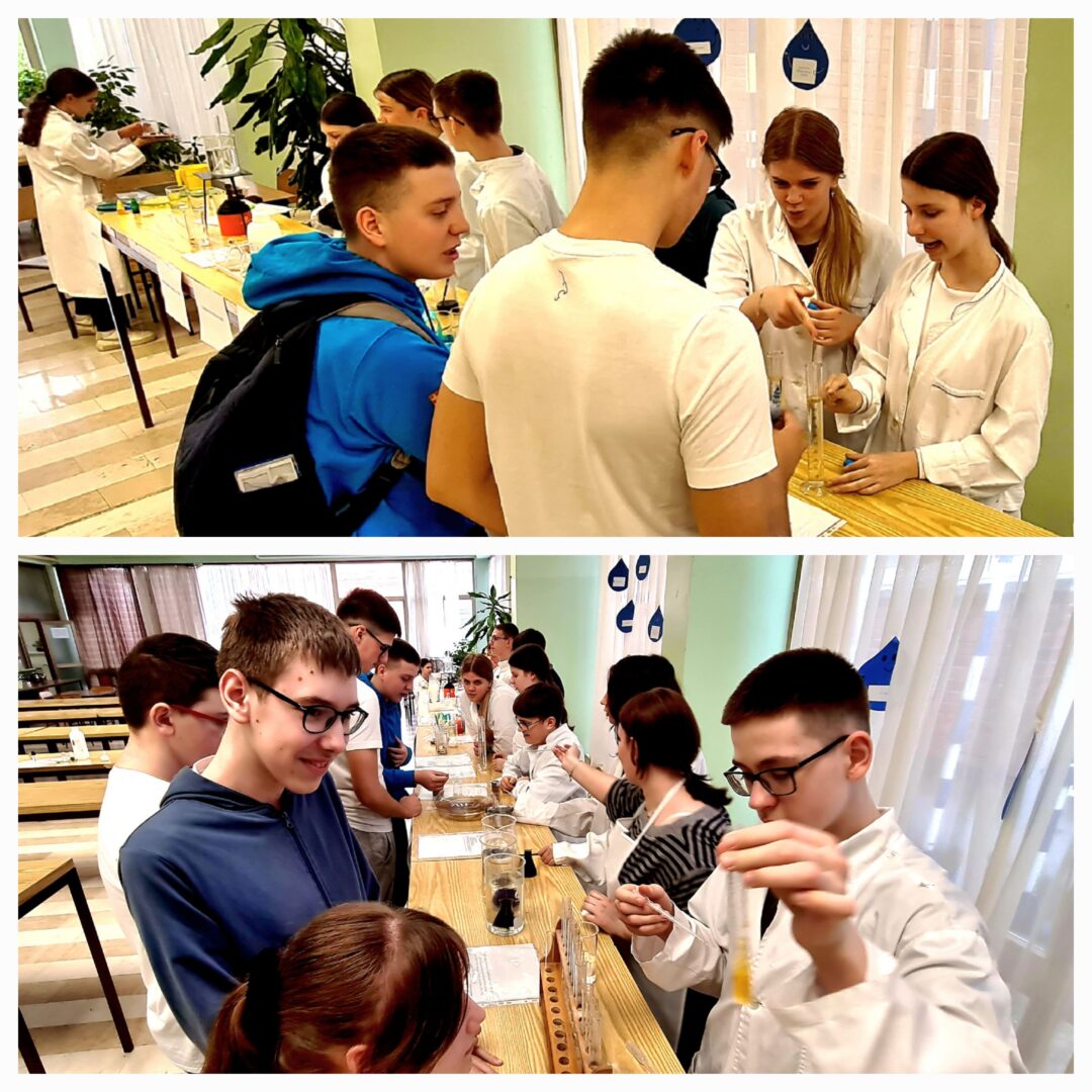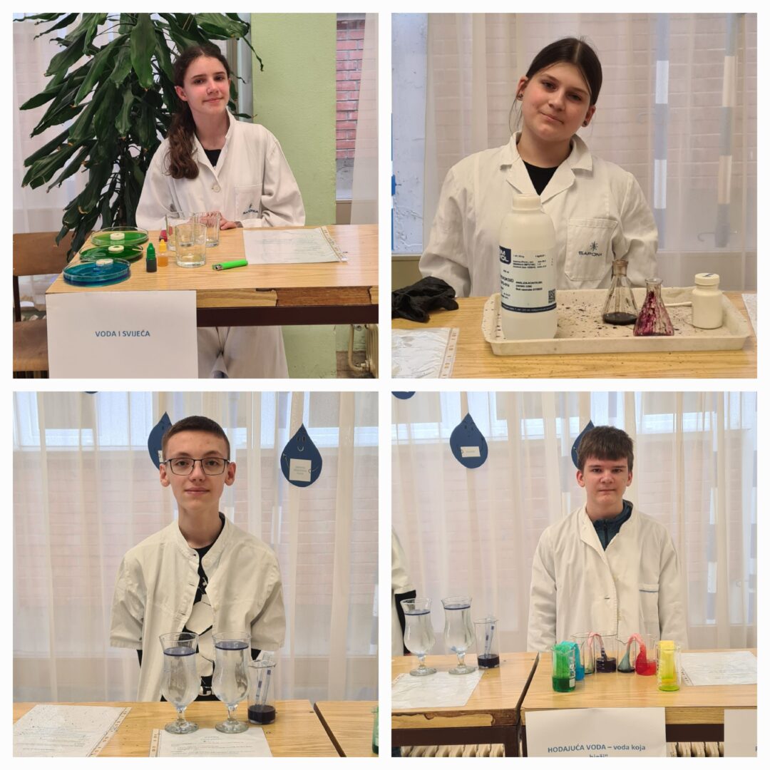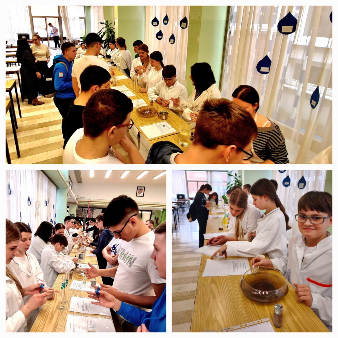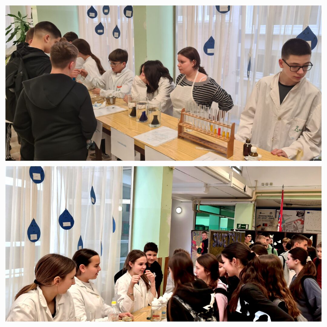 U holu škole obilježen je Svjetski dan voda kroz zanimljivu i edukativnu radionicu u kojoj su sudjelovali učenici 7. a razreda uz pomoć nastavnice kemije Tajane Barna. Učenici su pripremili te više puta demonstrirali i objasnili 20 pokusa s vodom pred učenicima 8. a i 8. b razreda.