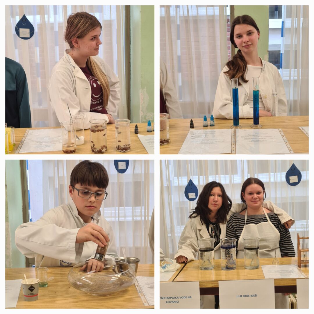 Kroz pokuse učenici 7. a razreda na jednostavan i zanimljiv način prikazali su različita svojstva vode, poput gustoće, površinske napetosti, kapilarnosti, topljivosti, kruženja vode u prirodi, difuzije, nastajanja vodene pare itd. Svaka demonstracija bila je popraćena kratkim objašnjenjem čime su učenici pokazali stečeno znanje kao i vještine javnog nastupa i suradnje sa starijim učenicima.