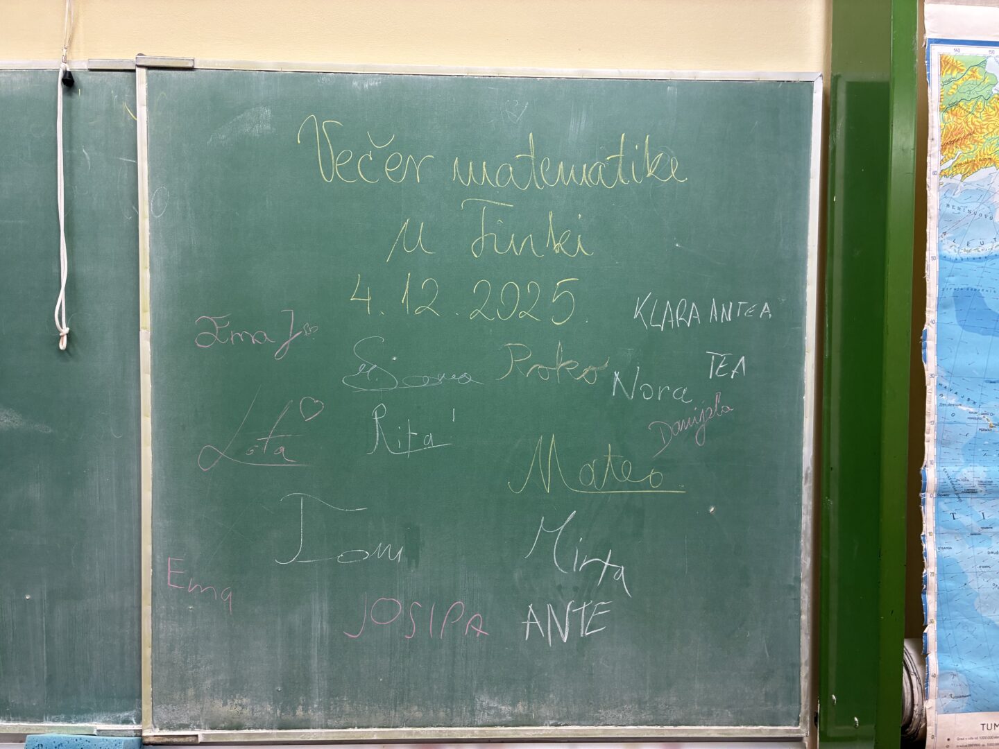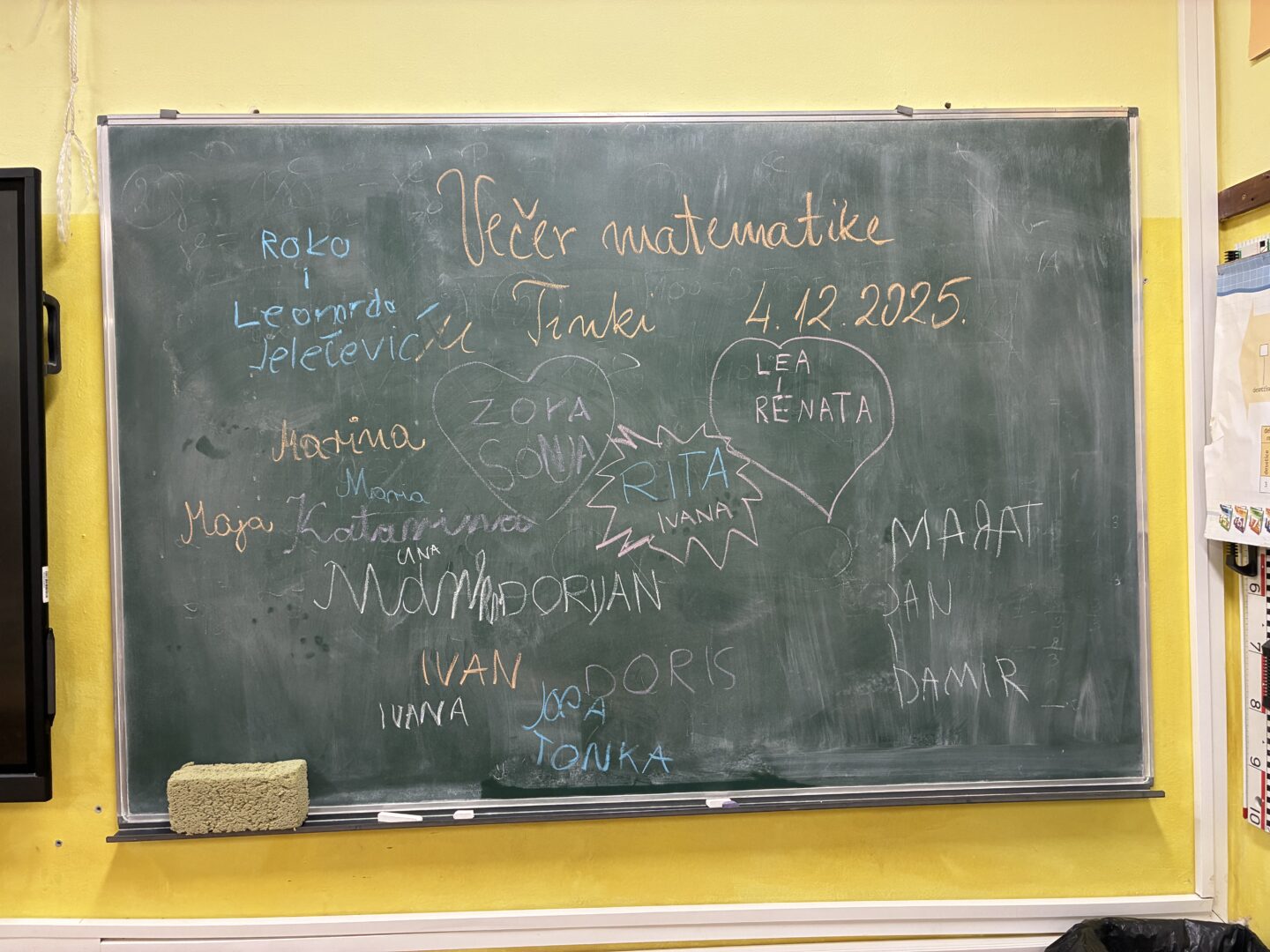 Naša je škola ponovno bila dio velike manifestacije koja se održava u cijeloj Hrvatskoj – Večer matematike! Manifestacija se održala u četvrtak, 4. prosinca 2025., predstavivši niz interaktivnih radionica koje otkrivaju veselu i kreativnu stranu matematike te pokazuju kako se matematički problemi mogu uspješno rješavati u svakodnevnom životu, često i bez da smo svjesni vlastitog talenta.